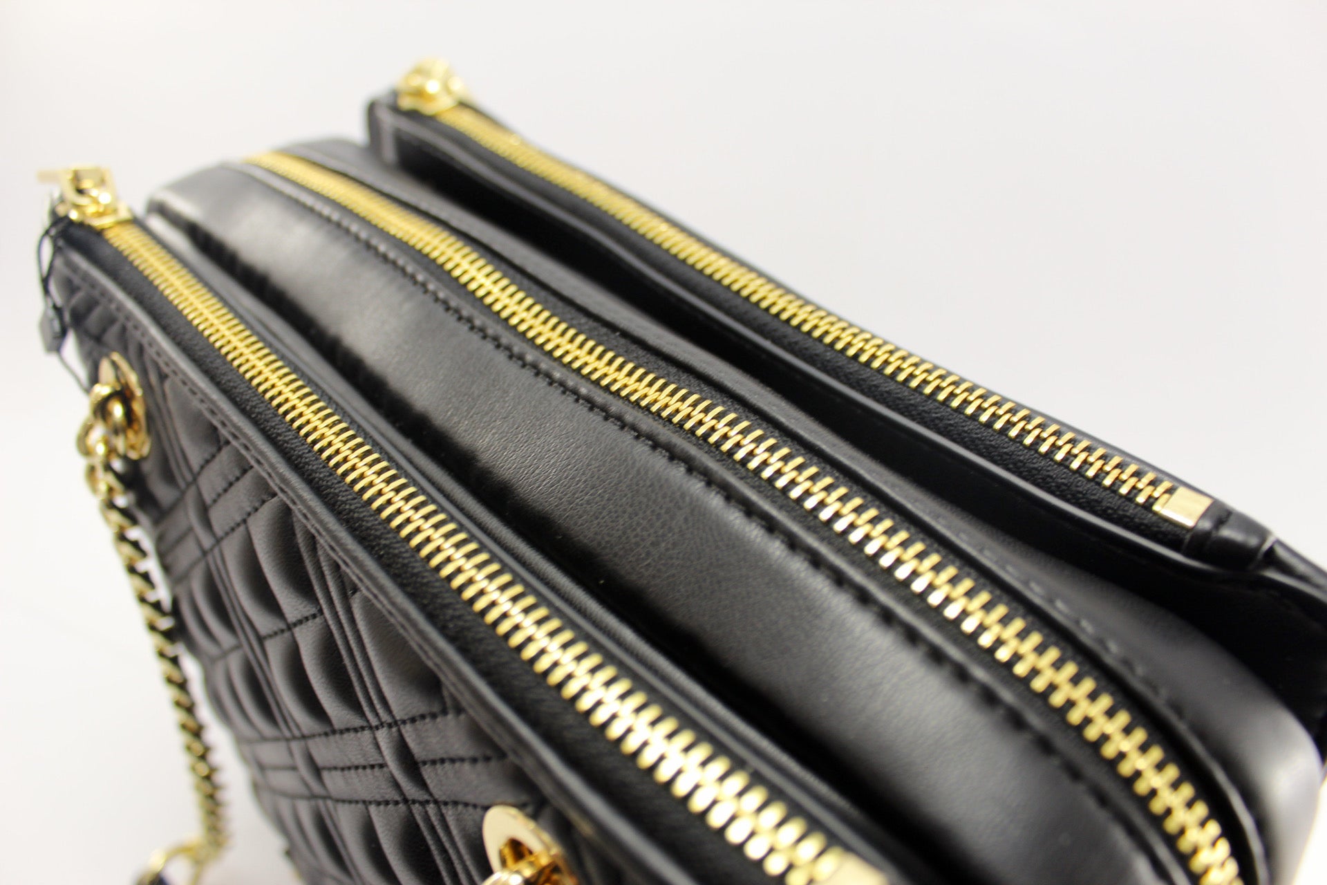 - Alça de ombro em corrente de metal dourado com detalhe em pele